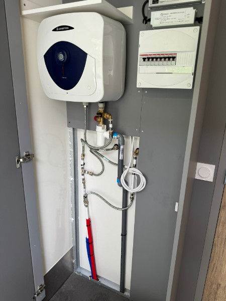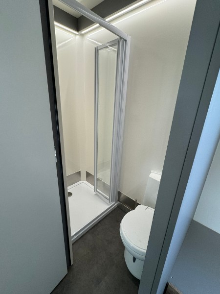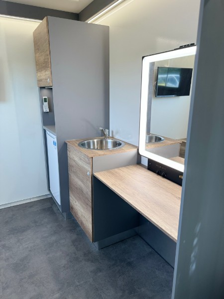 Laromorque a veillé à inclure une douche avec eau chaude et froide, ainsi qu'une toilette, garantissant ainsi un confort optimal. Ces installations sanitaires permettent aux artistes de se rafraîchir et de se préparer dans les meilleures conditions.