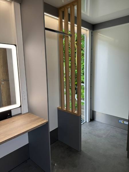 Enfin, une penderie a été installée pour permettre aux artistes de ranger leurs vêtements et accessoires de manière organisée et accessible. Ce détail pratique participe au confort global de l'espace de vie mobile.