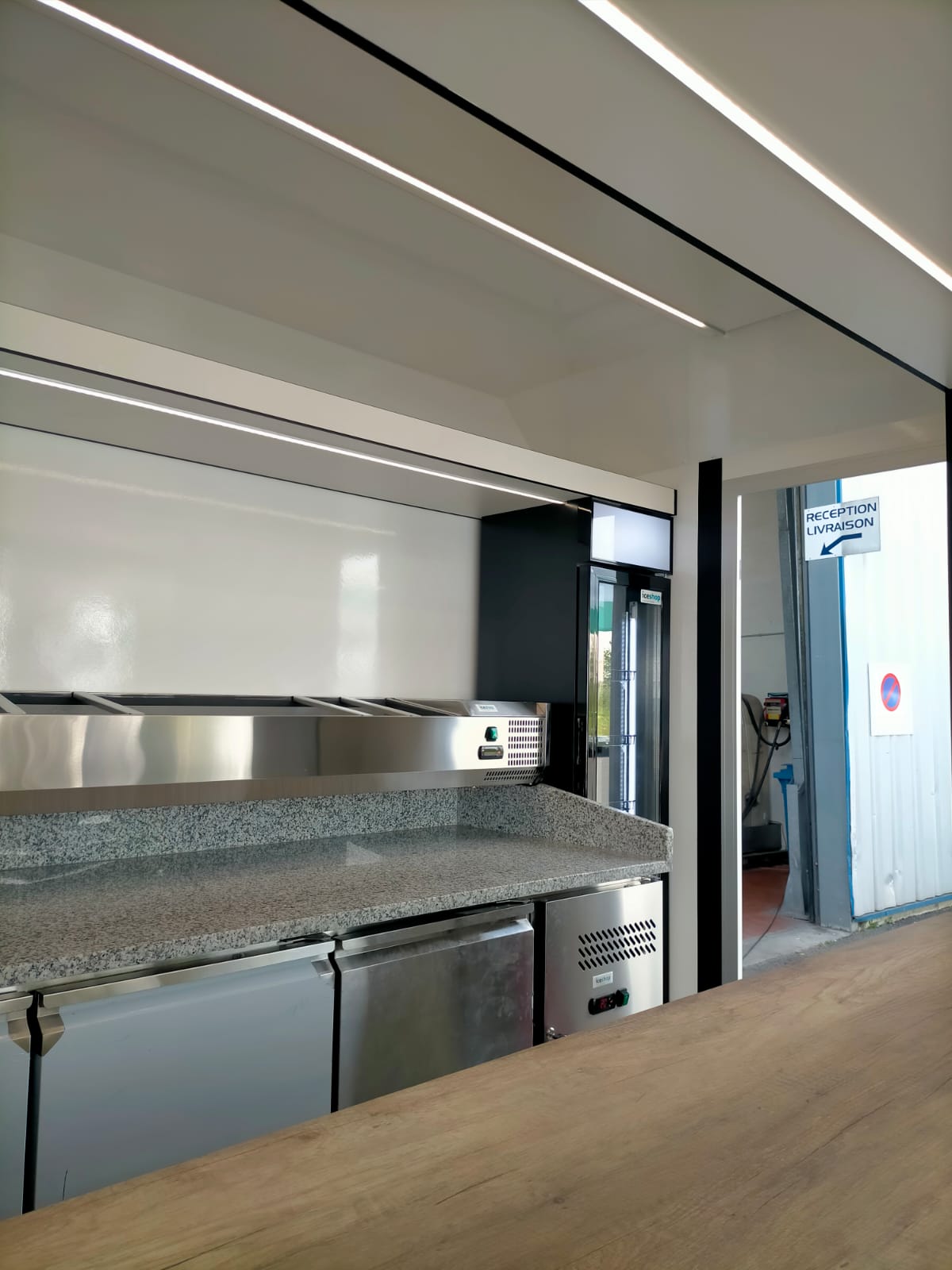 La façade avant et les joues de séparation ont également bénéficié d'un traitement esthétique, contribuant à l'aspect professionnel et attrayant du foodtruck. Chaque élément a été pensé pour allier fonctionnalité et esthétique, créant ainsi un espace de travail agréable et une image de marque positive pour le client.
